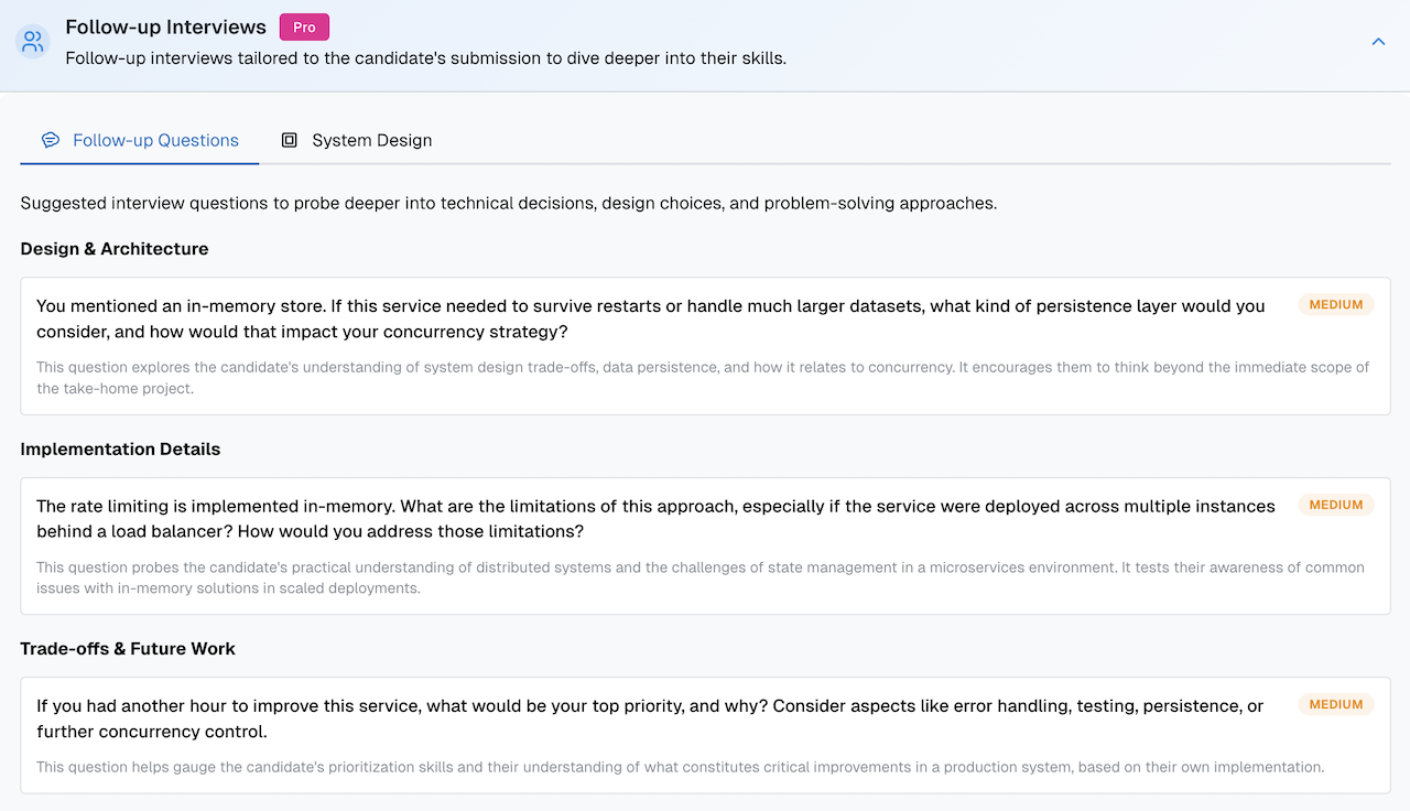 Our platform analyzes the submission to generate probing follow-up interview questions as well as what you're evaluating for. Each question references specific decisions the candidate made.