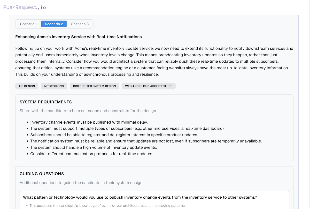 Design prompts extend the candidate’s own submission, keeping the conversation grounded and relevant.